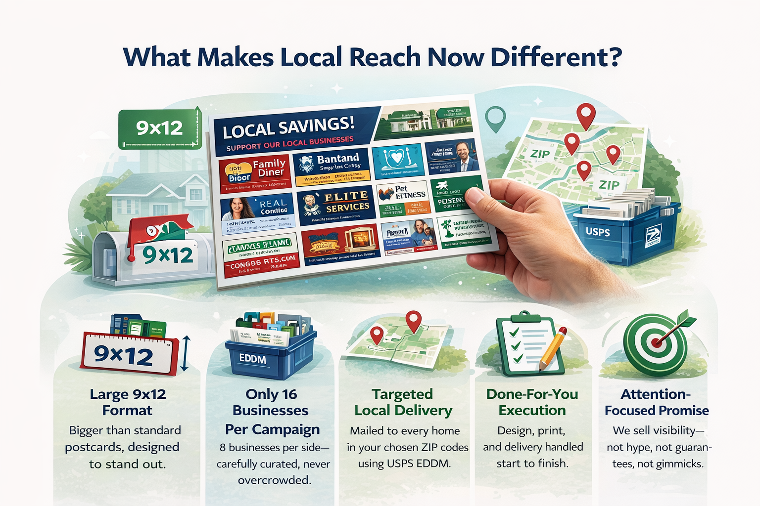 Local Reach Now helps local businesses stand out with shared 9x12 postcard marketing campaigns mailed directly to neighborhoods through USPS Every Door Direct Mail.