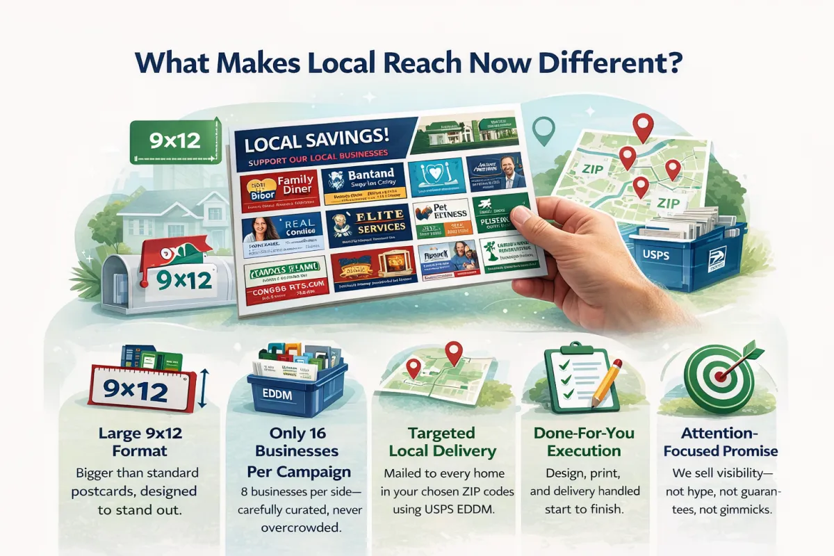 Join other trusted local businesses on our large-format 9x12” postcard — designed, printed, and mailed through USPS Every Door Direct Mail®.